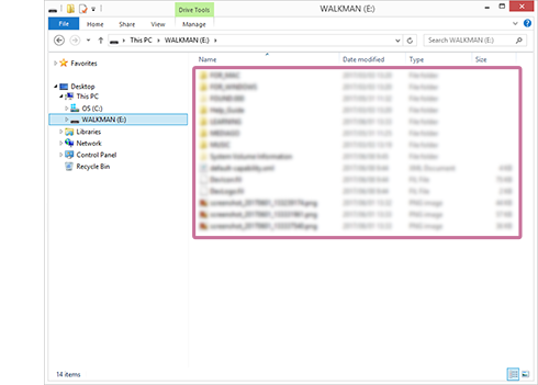 Aparecera uma lista de pastas no Walkman da seguinte forma. Neste caso, nao tem de executar o procedimento subsequente. Use “Music Center for PC” como esta.