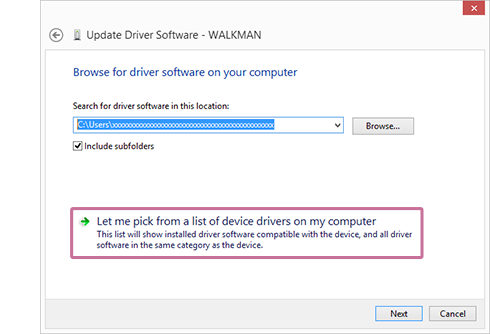 Selecione [Procurar software do controlador no computador] no ecra visualizado e, em seguida, selecione [Permitir escolha a partir de uma lista de controladores de dispositivos no computador].