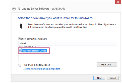 Selecione [Dispositivo de armazenamento de massa USB] e, em seguida, selecione [Seguinte].