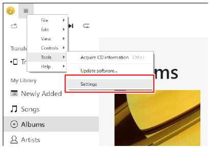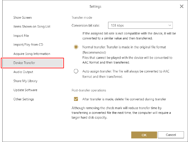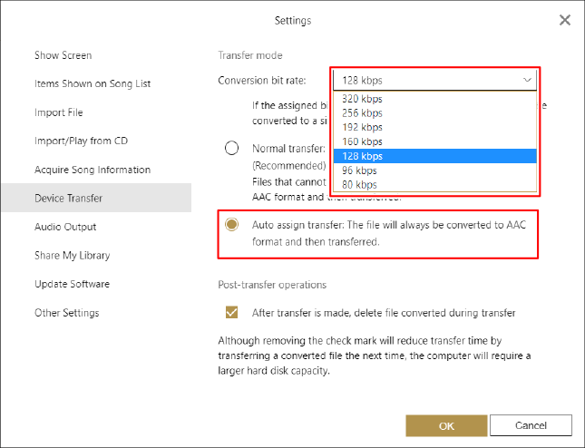Selecione [Atribuição automática de transferência: O ficheiro será sempre convertido para o formato AAC e depois transferido.] em [Modo de transferência] e, em seguida, selecione a taxa de bits desejada a partir do menu pendente [Taxa de bits de conversão:].