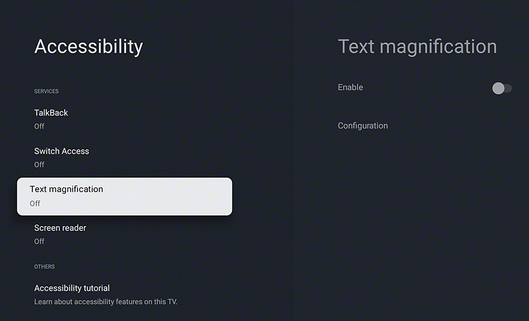 O leitor de ecrã Talkback permite-lhe consultar os guias de programas televisivos no ecrã e alterar as definições do televisor sem olhar para o ecrã. Também permite ampliar o texto e apresentá-lo no ecrã. Adicionalmente, a presença de pontos táteis nos terminais HDMI e S-Center dos televisores BRAVIA coincidem com os pontos táteis dos produtos da gama BRAVIA Theatre, simplificando assim a localização e conexão das portas e facilitando as configurações.